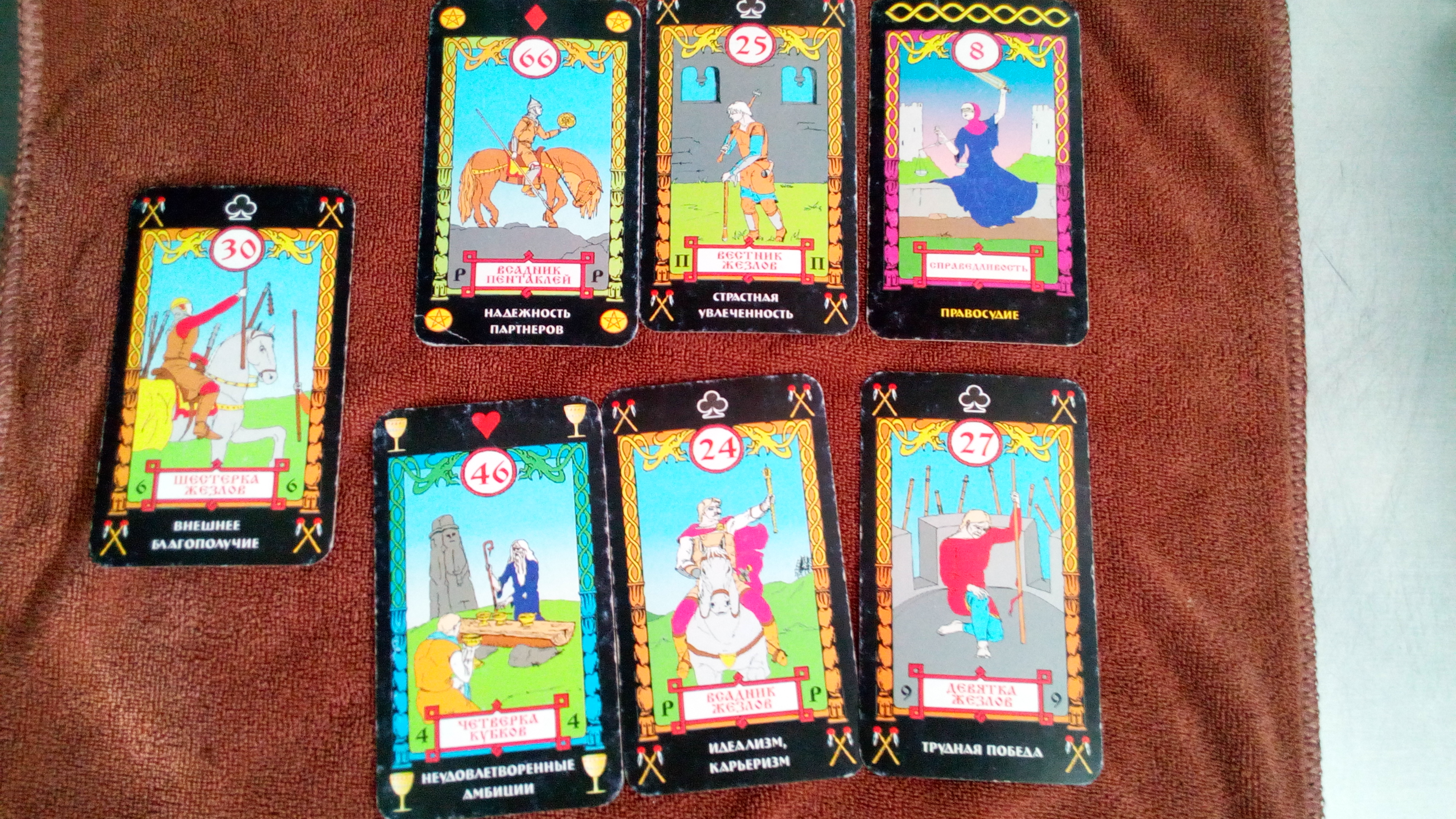 Лично моё мнение то что мч) и вправду решил отгородиться,но потому что не знает сам справиться ли он с такими отношениями. Вот кстати и по картинке у меня 7ж это мужчина взявший в руки дубину готов к обороне.Лучше дать ему время собраться с мыслями и подумать. Не торопите события))Agorra писал(а): Девушки, вопрос: какое решение для себя принял МЧ в отношении меня: дама жезлов, Дьявол, 7 жезлов. Дно ТМечей. Я так понимаю избежать соблазна и отгородиться. Причем тут ситуация повернулась также, как у Кали-Юга, изначально я выпадала как Дама Кубков, теперь несколько раз Дамой жезлов....