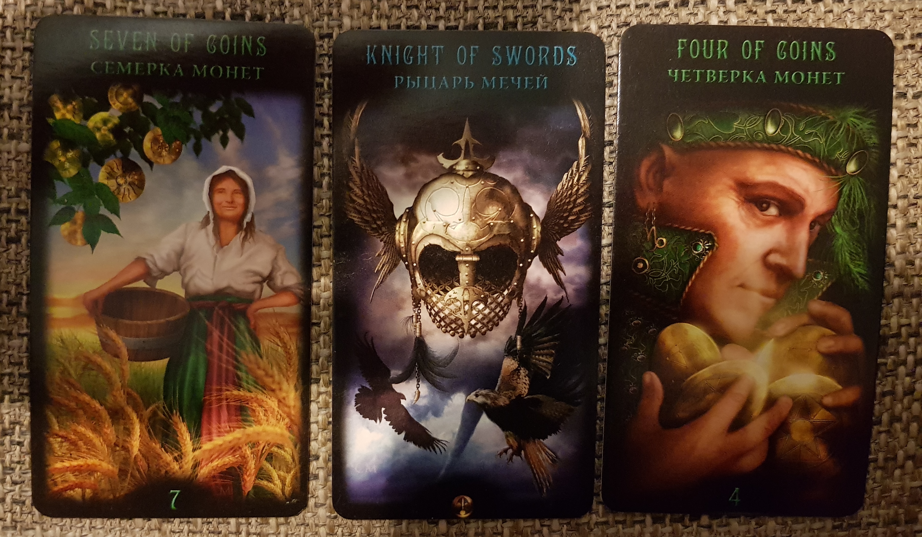 семерка пентаклей - рыцарь мечей - четверка пентаклей.