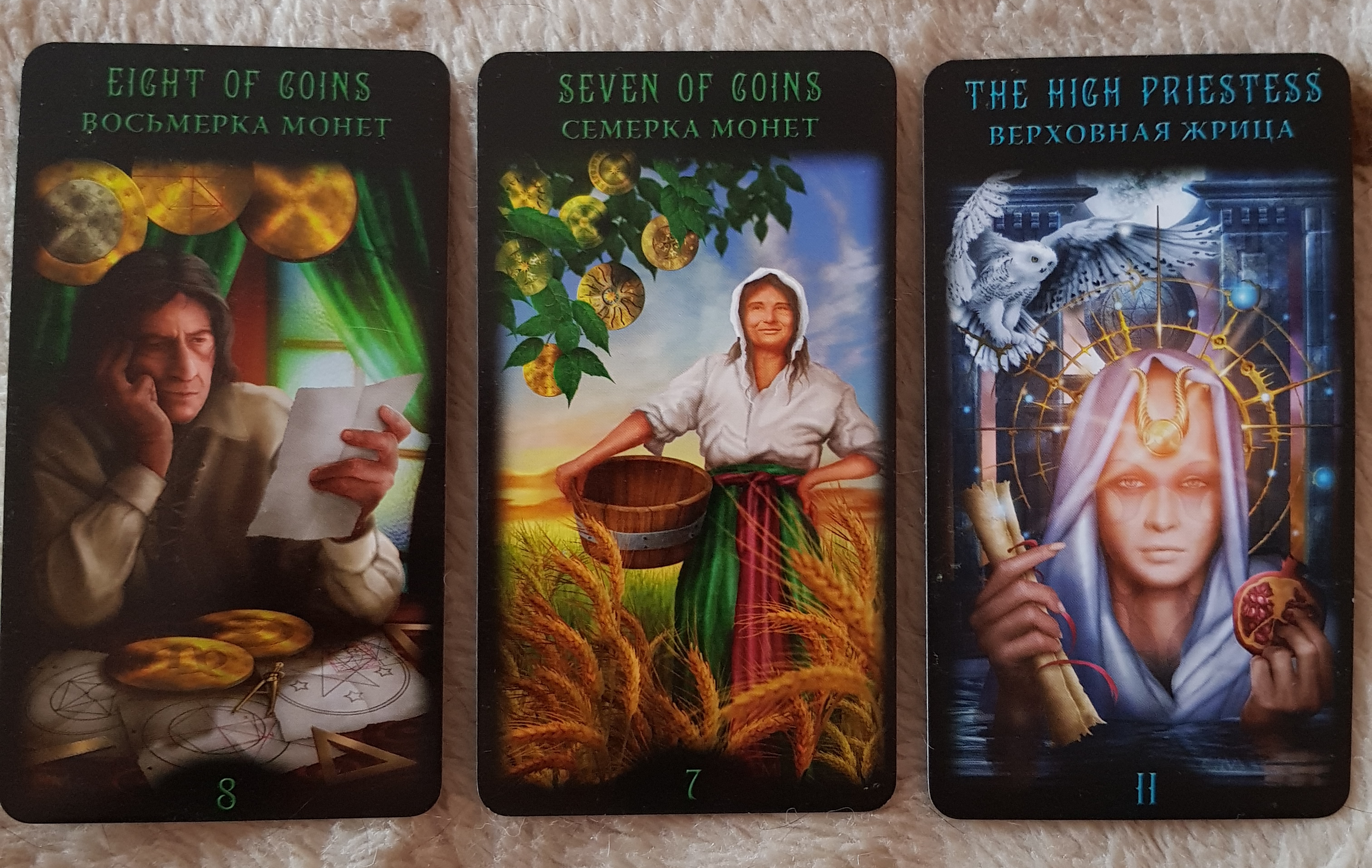 8 пентаклей, 7 пентаклей и Жрица. Квинт Сила.