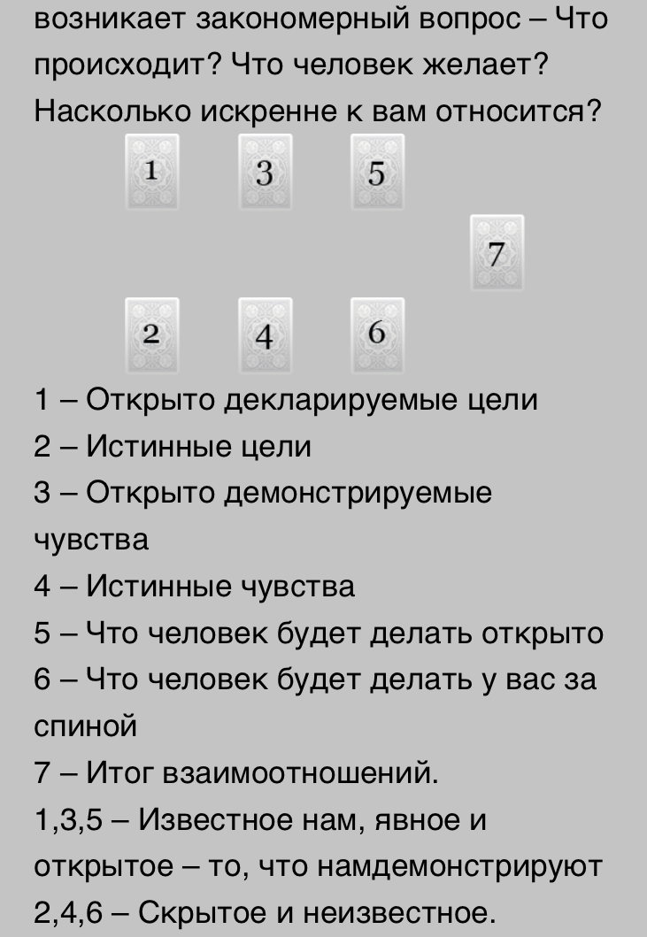 2,4,6 – Скрытое и неизвестное. (Нижняя строчка) и крайняя карта это итог взаимоотношений.