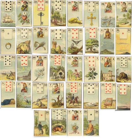 Центральный квадрат расклада-Мч в доме сов, лилии в доме ребенка, рыбы в доме сада и звезды в доме горы.