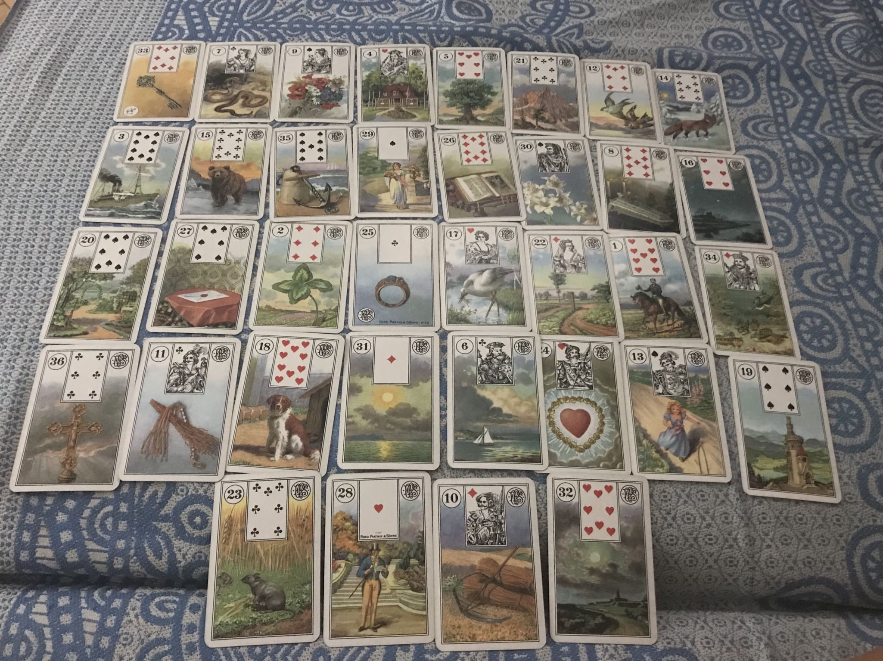 Расклад на женщину, отношений нет, обозначили только сферу ЛЖ, до конца года, будущее справа. Из мужчин загадан лис и собака, бланкой мужчины обозначили потенциального кавалера, если наметятся отношения.